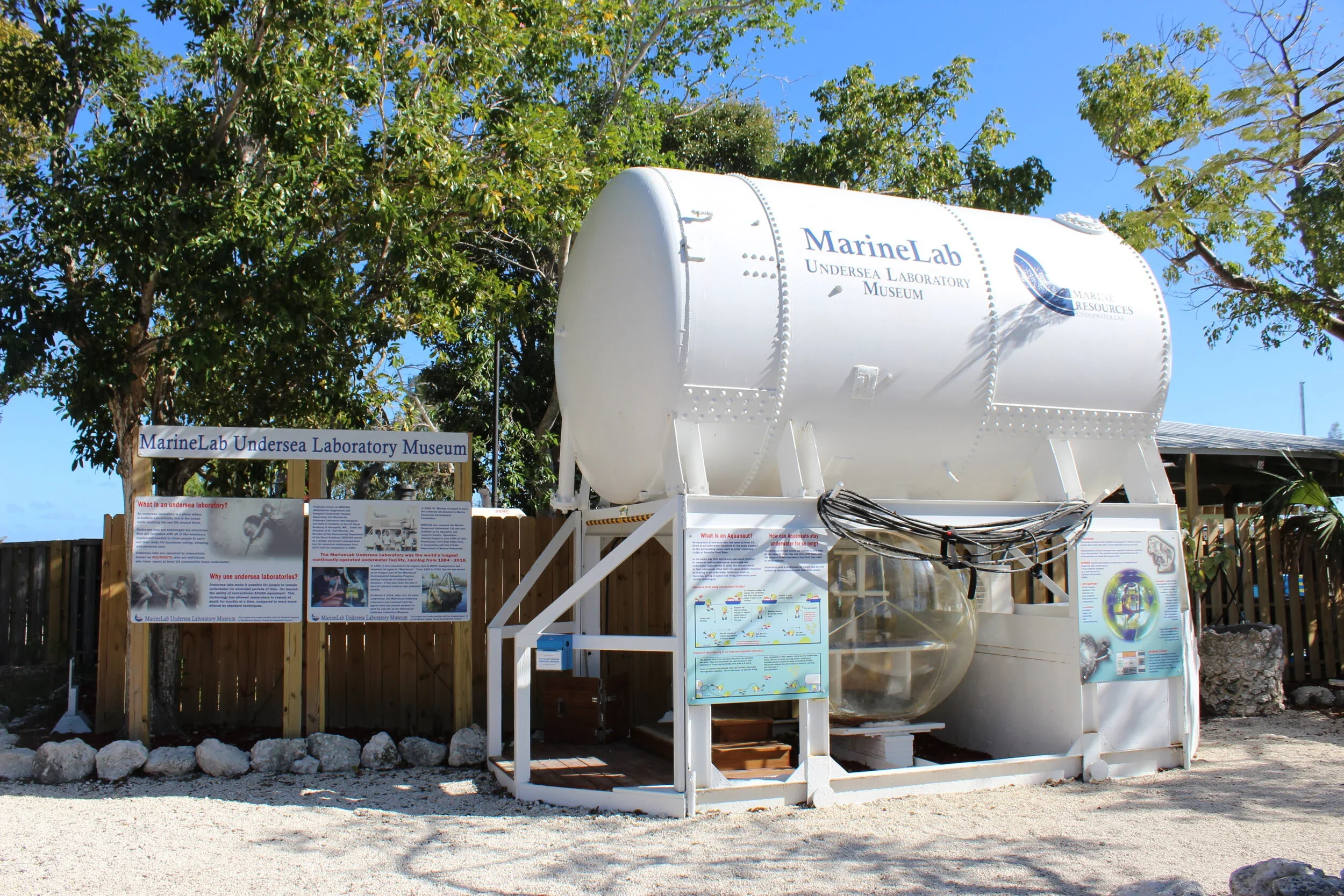 From 1985 to 2018, the MarineLab Undersea Laboratory was located in a lagoon at MRDF’s campus in Key Largo. During its operational years, the laboratory hosted hundreds of aquanauts—ranging from students to medical researchers—who stayed overnight in the Undersea Lab. In 2018, the laboratory was raised from the lagoon and restored to its 1985 condition. Today, the Undersea Laboratory serves as a museum where visitors can climb inside the habitat and experience what it was like for aquanauts to stay underwater, all while remaining dry.